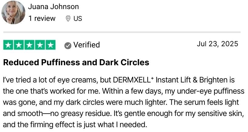 Eliminated Stubborn Dark Circles & Discoloration: 97% of women over 50 develop persistent dark circles as skin thins dramatically and circulation weakens with age. DERMXELL⁺'s advanced brightening complex penetrates deeper into mature skin, targeting age-related pigmentation and vascular changes that make concealer ineffective.