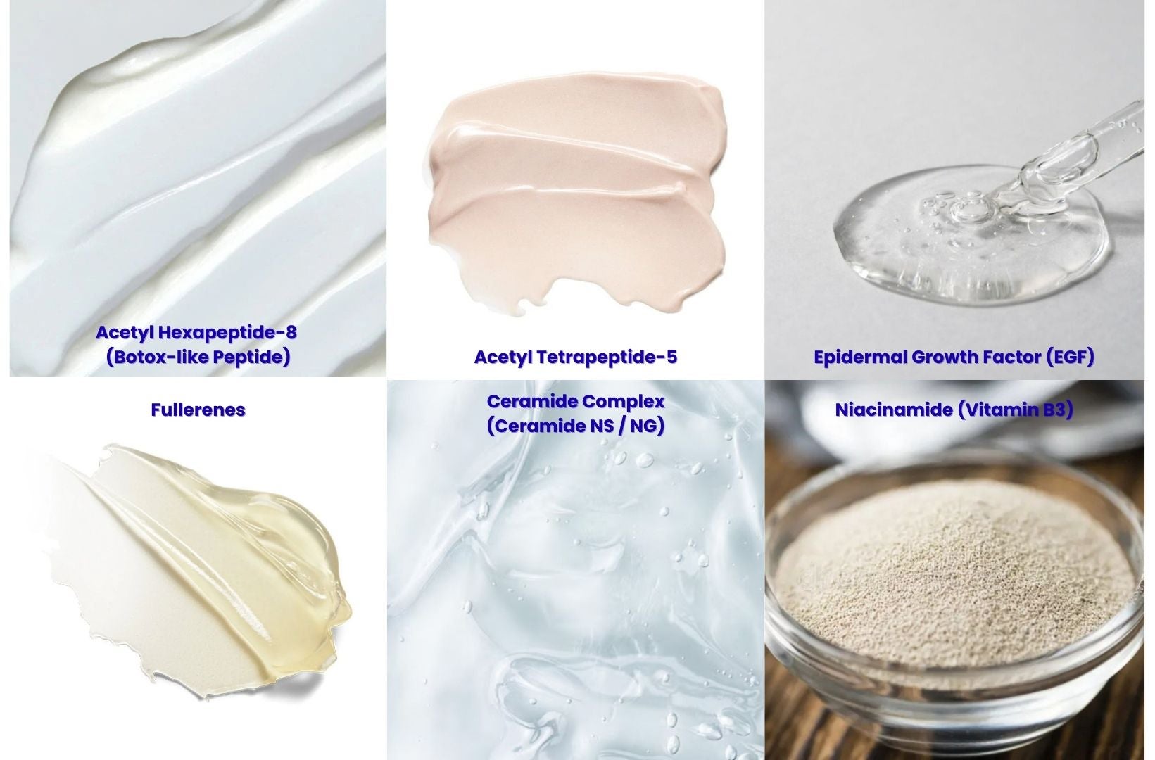 "Peptide complexes combining Acetyl Hexapeptide-8, Acetyl Tetrapeptide-5, and bio-identical EGF are clinically shown to smooth expression lines, reduce puffiness and dark circles, and stimulate collagen renewal. Supported by antioxidant protection, this targeted therapy promotes firmer, brighter, and healthier under-eye skin over time."